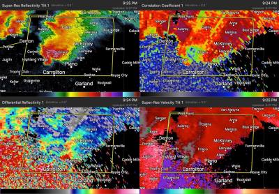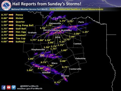 Several storm-splits and storm-mergers occurred on the evening of March 26th. These supercells interacted with one another, and resulted in an intense supercell that moved over the northern part of the Dallas/Fort Worth metroplex. Due to the storms merging together into one large supercell north of the metroplex, the intensity of the updraft increased tremendously and the storm was warned for hail to baseball size (2.75″ in diameter). There were, however, many reports of hail larger than baseballs, including some near softball size as mentioned above.