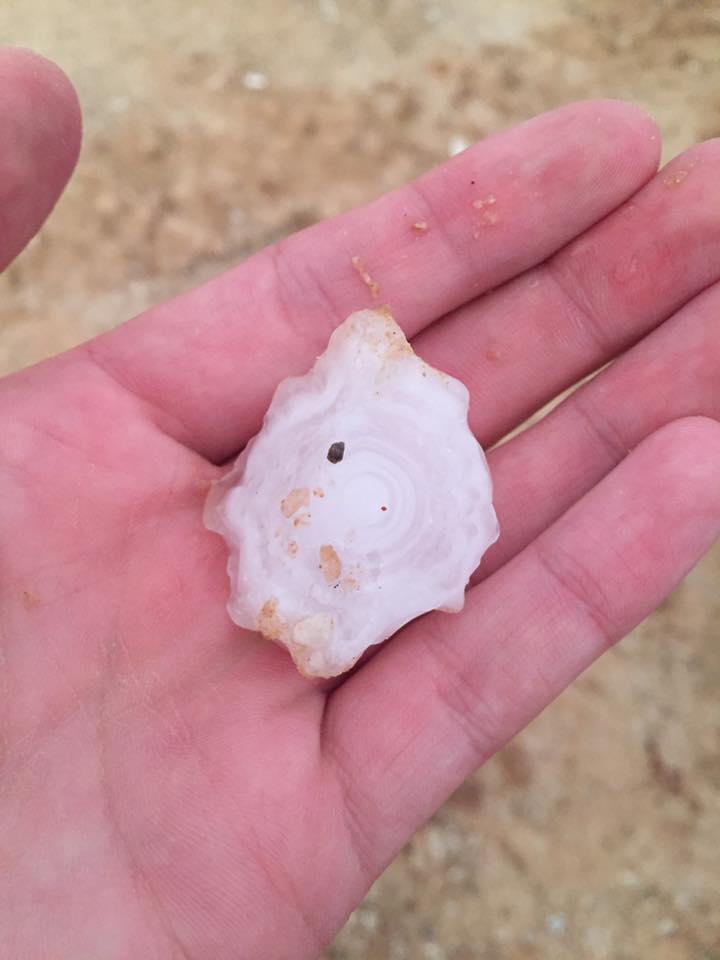 Our position was approximately one mile south of the main hail core that was producing observed baseball sized hailstones. A few hailstones were flung far out of the downdraft and landed at our location. Given the abundance of very dry and cold air aloft, these hailstones underwent a dry hailstone growth. As a result, this hailstone which was about ping-pong ball size split upon impact and had a textbook denotation of the layers, or “rings” like that of a tree, of ice that coalesced around one another as it was suspended in the updraft.