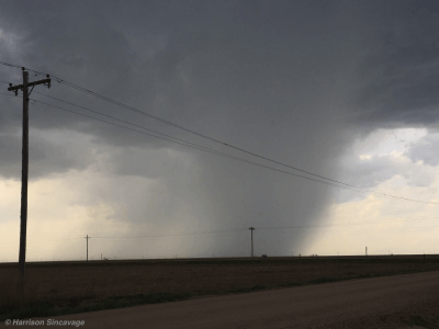 After multiple storm splits, supercells ended up merging together due to the weak winds aloft. The supercell drifted north of town and began to produce even larger hail up to baseball size. As the cloud base height (lifted condensation levels; LCL) lowered, there was a narrow window for an isolated tornado potential. We positioned about one mile south of the hail core, and observed three brief tornadoes. The tornadoes were later confirmed by observations from the Doppler on Wheels involved with the TWIRL project.